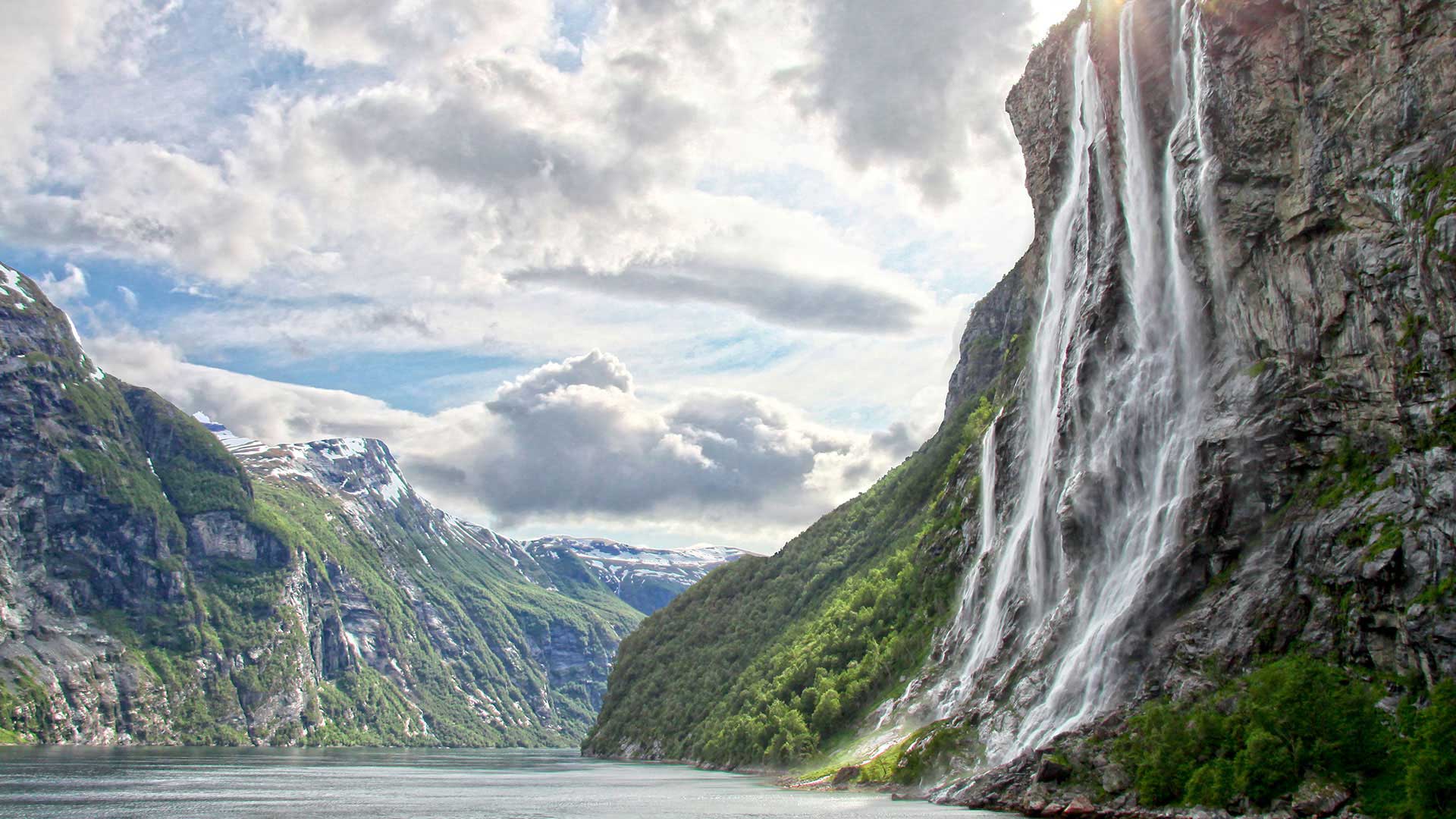 Two of the most spectacular highlights of the UNESCO-listed Geirangerfjord are the Seven Sisters (De Sju Søstre) and Bridal Veil (Brudesløret) waterfalls. Both are at their most beautiful in the springtime when the melting snow creates a powerful surge of water down the mountainside.