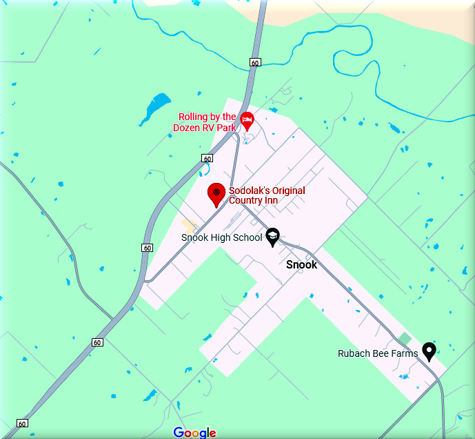 Sodolak’s Original Country Inn is conveniently located in Snook, Texas. 9687 Fm 60, Snook, TX 77878 +1 979-272-6002