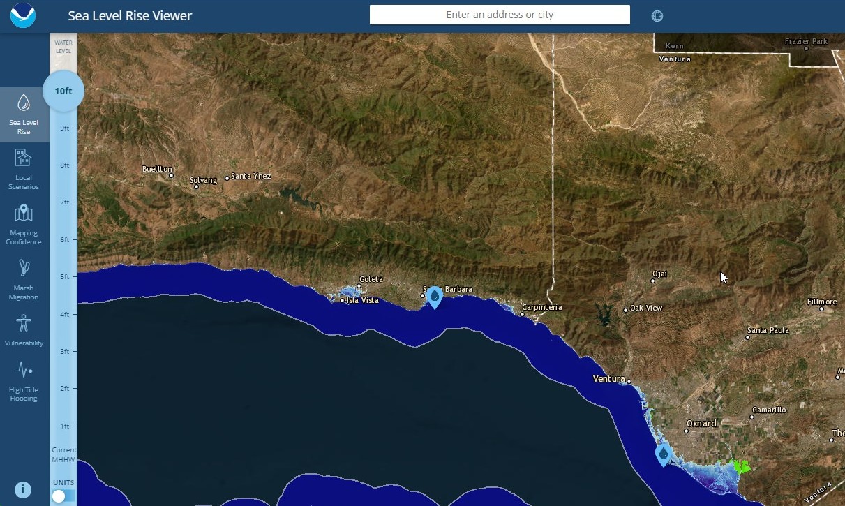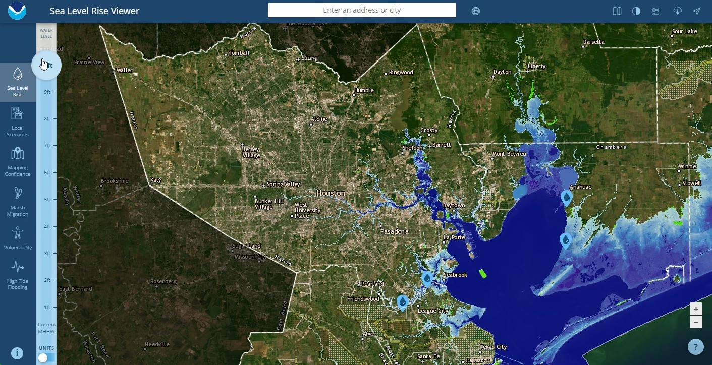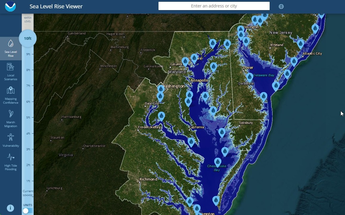 NOAA’s Sea Level Rise map viewer gives users a way to visualize community-level impacts from coastal flooding or sea level rise (up to 10 feet above average high tides).