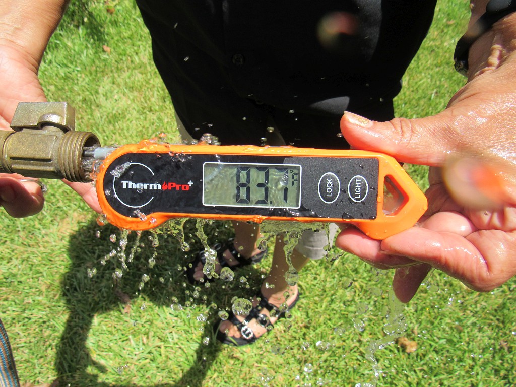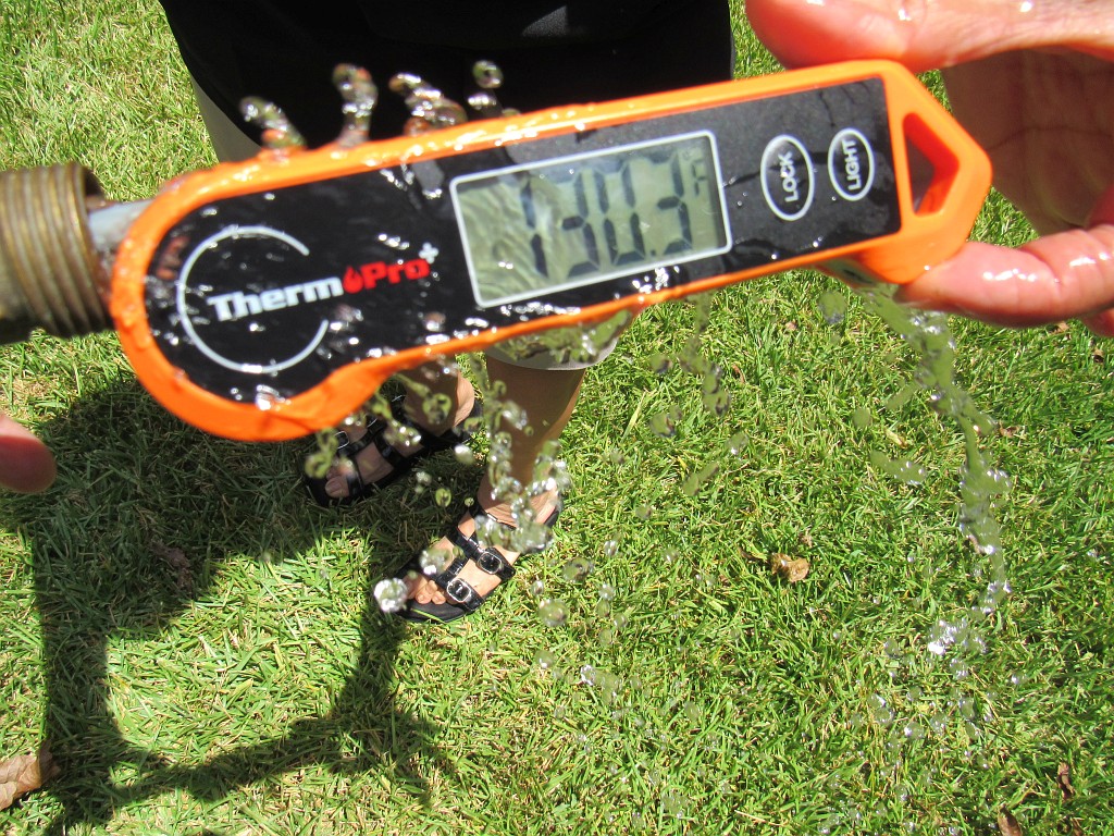 UC#4-SU and Sally T. Intern explore the noon temperature of water coming out of the garden house in CenTex. Today’s high projected to be 101°. [ed. note: we’re not using centigrade here, because we’ve been informed that the metric system is a gateway to socialism.]