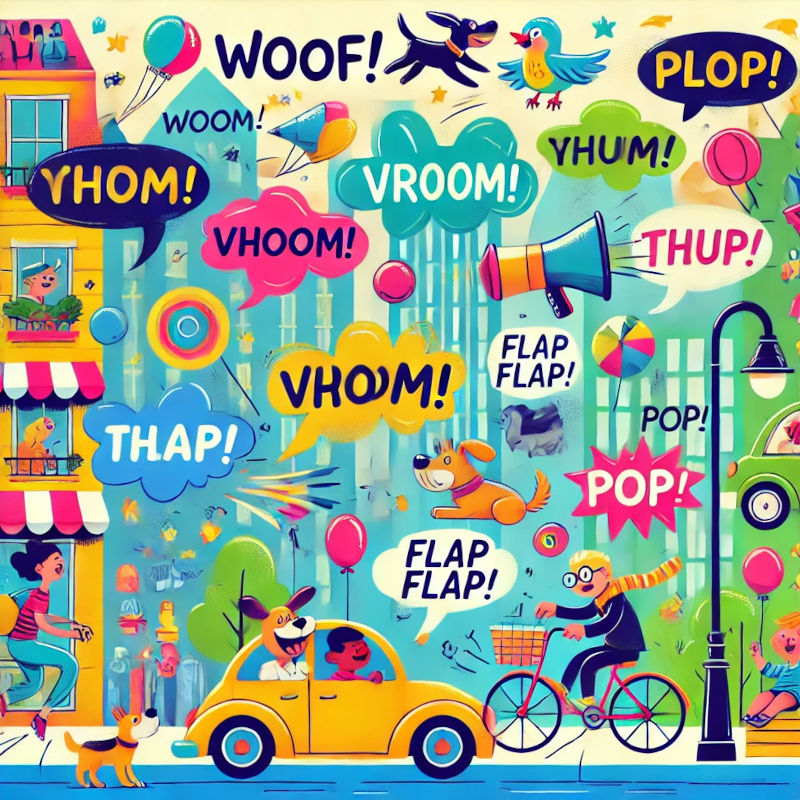 Nature Sounds: Splash – sound of something hitting the water Thud – sound of something heavy hitting the ground Whoosh – sound of something moving fast through the air Crackle – sound of a fire burning Gurgle – sound of water flowing or bubbling Rumble – deep, rolling sound, like thunder Pitter-patter – sound of light rain Boom – deep, loud sound, like thunder Zoom – sound of something moving quickly, often used for cars