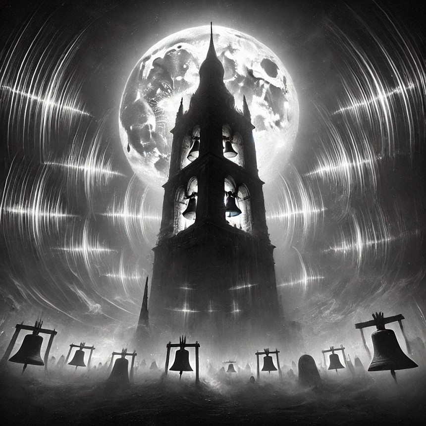 “The Bells” is a heavily onomatopoeic poem by Edgar Allan Poe which was not published until after his death in 1849. It is perhaps best known for the diacopic use of the word “bells”. The poem has four parts to it; each part becomes darker and darker as the poem progresses from “the jingling and the tinkling” of the bells in part 1 to the “moaning and the groaning” of the bells in part 4. – Wikipedia