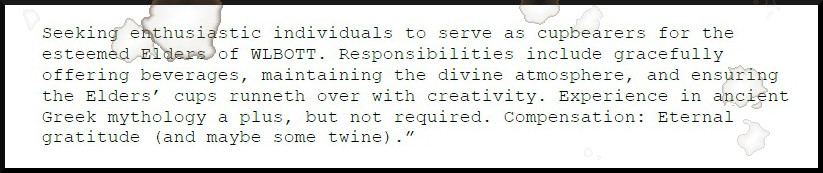 So the Roman gods had cup bearers. This begs the question: Why doesn’t WLBOTT have cup bearers?
