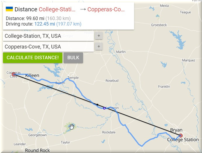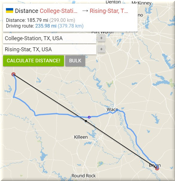199 km (Approximate driving distance from College Station to Copperas Cove, Tx)