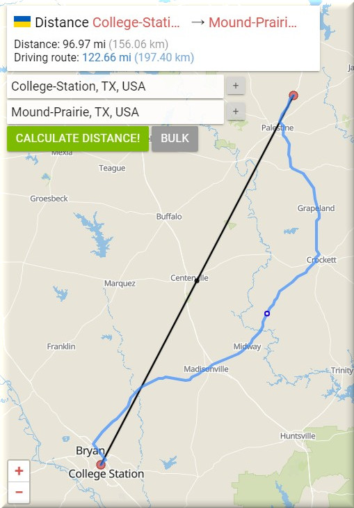 194 km (Approximate driving distance from College Station, Tx, to Mound Prairie, Tx)