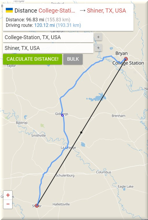 190km (The approximate driving distance from College Stations to Shiner, with a stop in Giddings.)