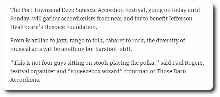 It didn’t take too many handshakes to zero in on the accordion, and from there to Those Darn Accordions (TDA). TDA was formed in 1989 by Linda “Big Lou” Seekins.