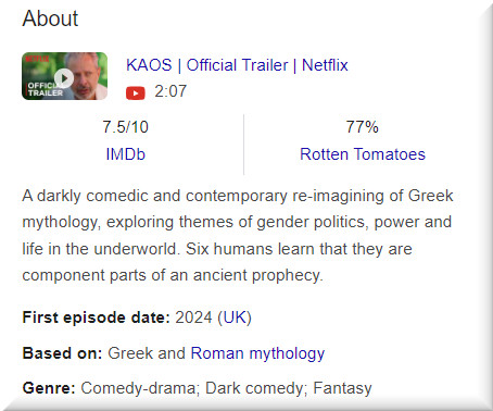 Kaos is a British mythological black comedy television series created by Charlie Covell for Netflix. It revolves around three humans as they discover their connection to each other and to a long-standing ancient prophecy while they deal with corrupt and arrogant gods of Greek and Roman mythology. The series was released on Netflix on 29 August 2024.