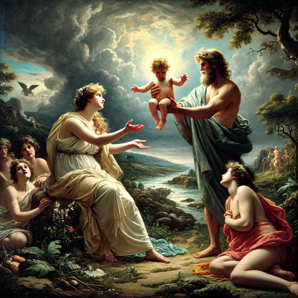 Elder G: Here is a classical-style painting depicting the birth of Zeus, with his mother Rhea handing him over to the nymphs on Crete, while the sky looms dark in the background, symbolizing the threat of Cronus. The scene captures both the tension and hope of Zeus’ birth.Wikipedia