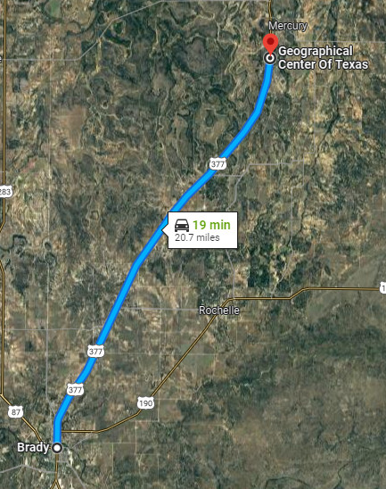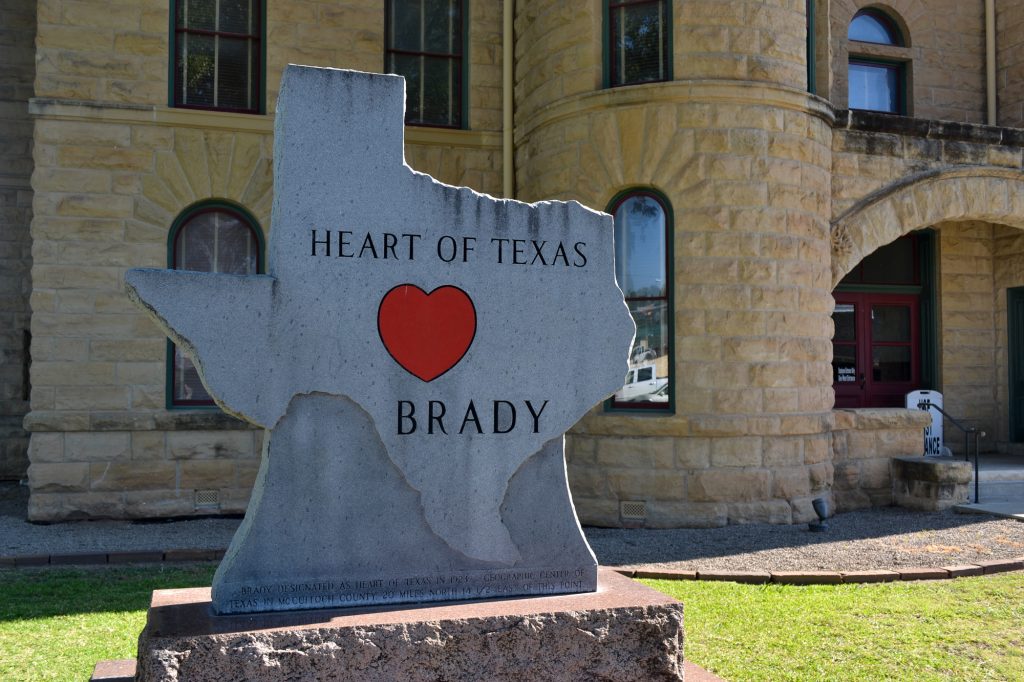 About 19 miles south of the geographic center is Brady, the heart of Texas.