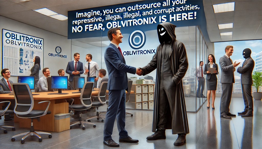 Imagine, you can outsource all your repressive, illegal, and corrupt activities! No fear, Oblivitronix is here!