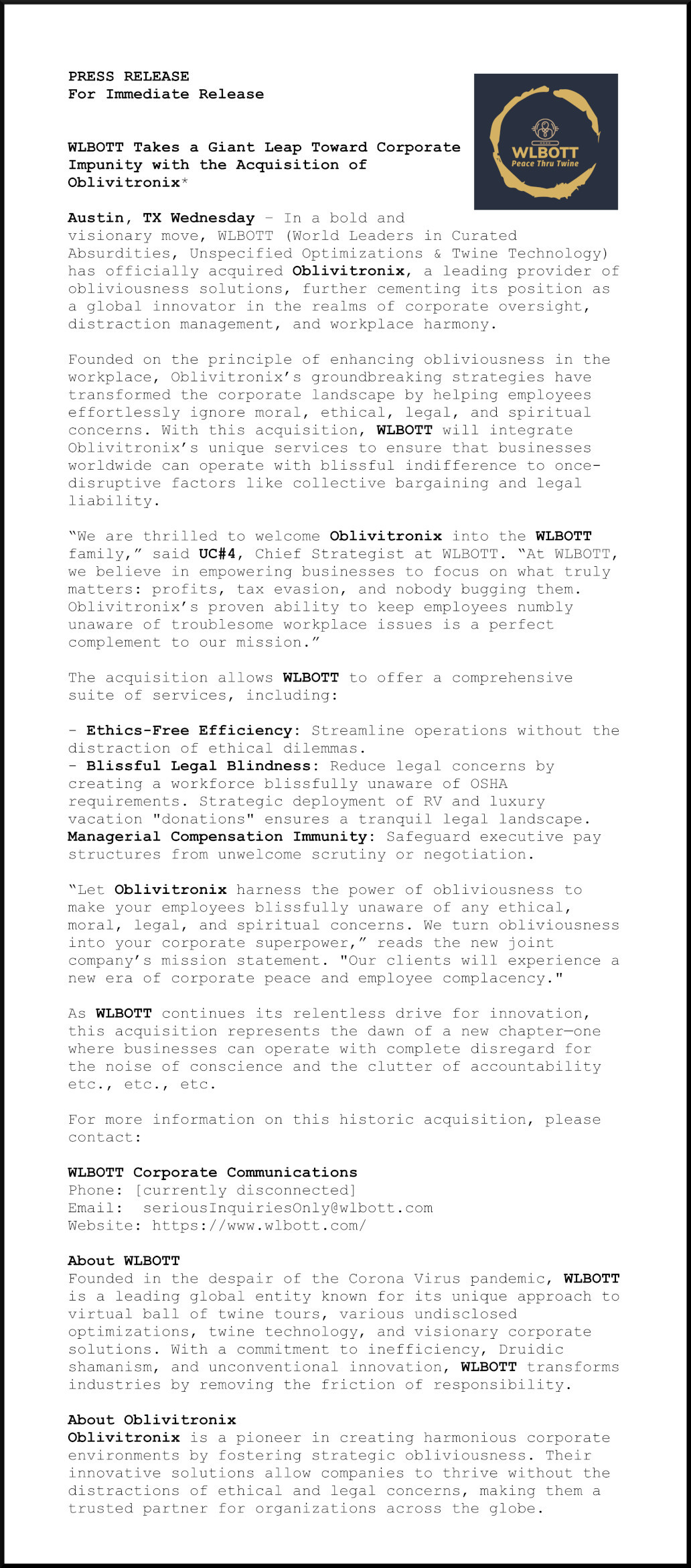 Oblivitronix: The Art, and the Science, of being Oblivious.WLBOTT is proud to announce the acquisition of Oblivitronix. We have used their services in the past, with great success.