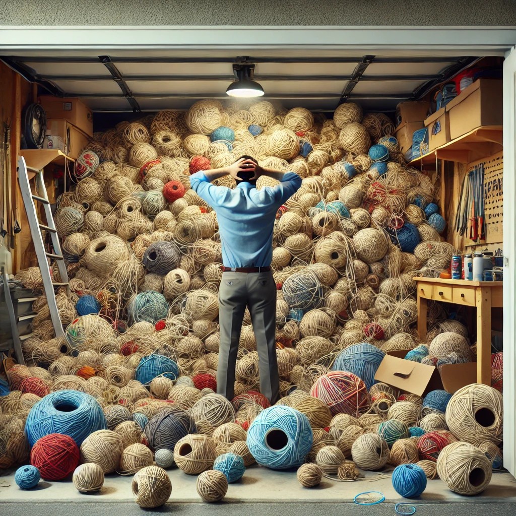 I think I see the bigger picture here. You are juggling too many balls (of twine). I’d like to recommend a spiritual retreat – a time of quiet reflection.