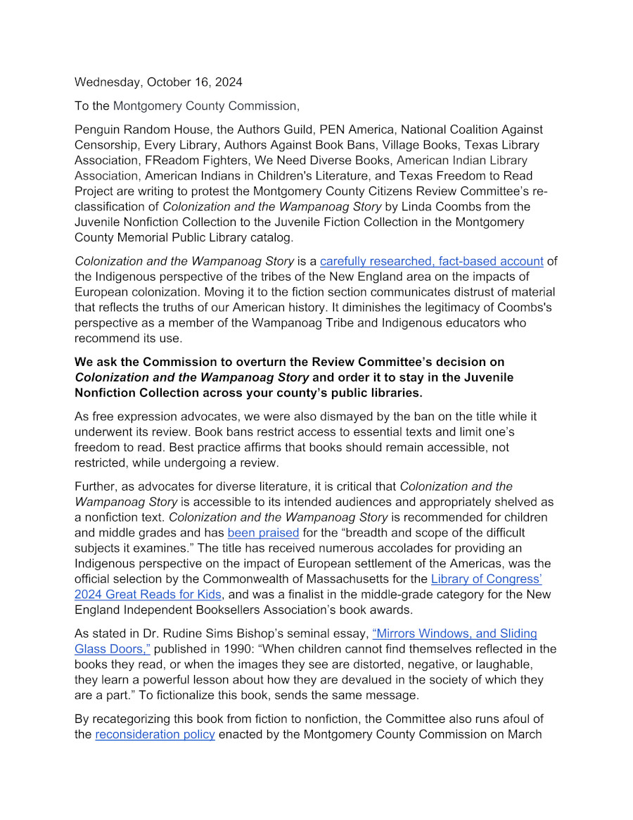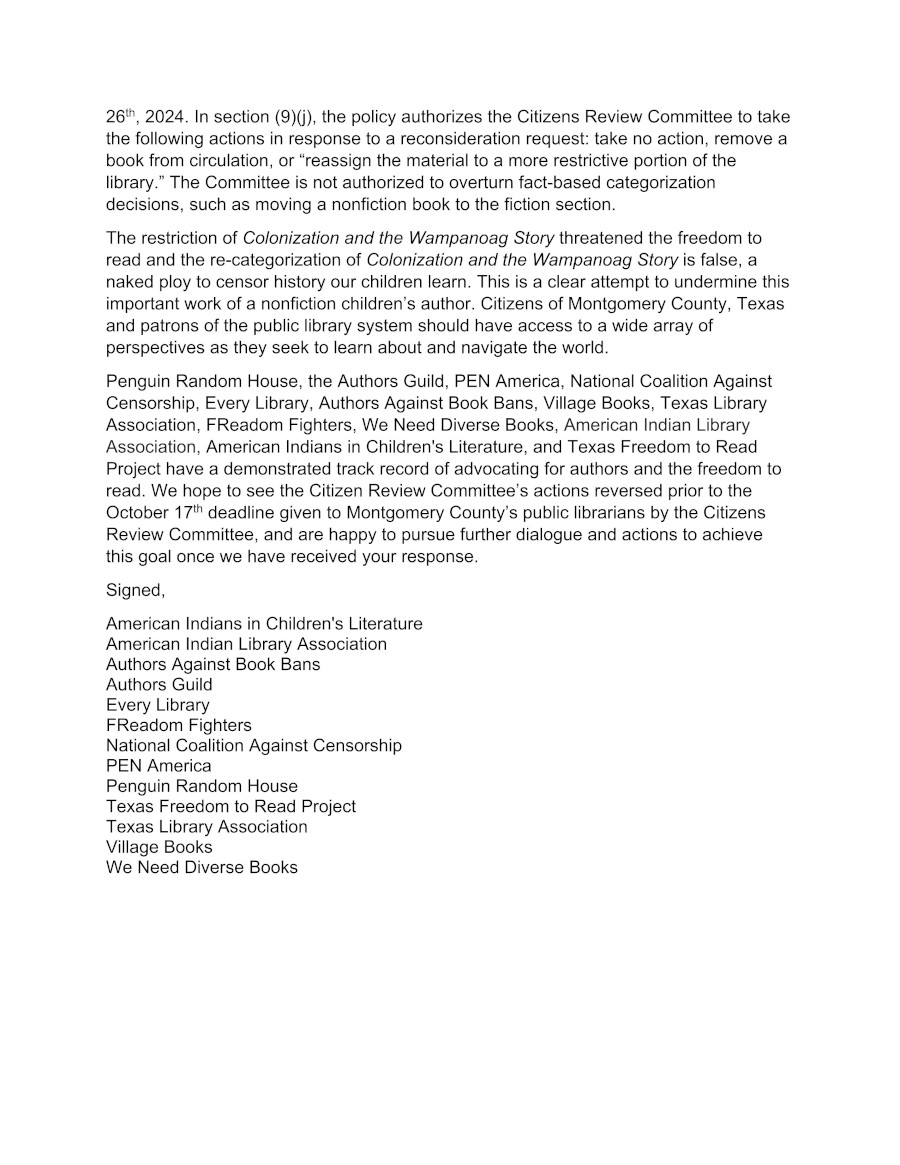 (NEW YORK)— A coalition of national and Texas freedom to read advocates, joined by publisher Penguin Random House, today called for the reversal of a decision in Montgomery County, TX, to reclassify from juvenile nonfiction to fiction a celebrated book that presents the Indigenous perspective on European colonization.