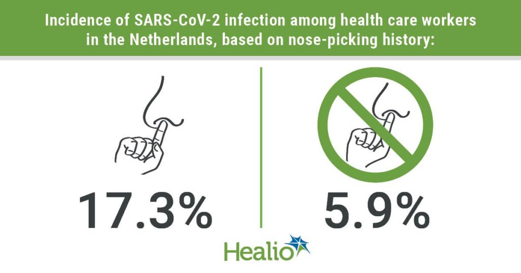 A study in the Netherlands published in 2023 found that healthcare workers who picked their nose were about three times more likely to contract COVID-19. The same study found no correlation between COVID infection and nail-biting, or with wearing spectacles or having a beard, which could interfere with fit of protective equipment.