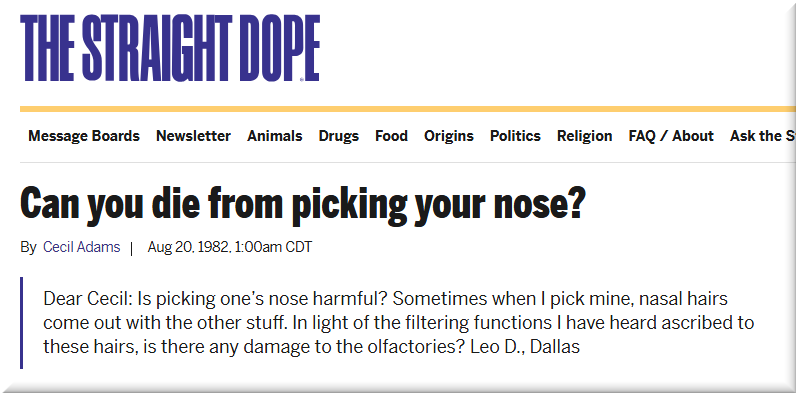 Medical risks and benefits Researchers at Griffith University have discovered a connection between bacteria and Alzheimer’s disease. They have found evidence that a specific bacterium (Chlamydia pneumoniae) is capable of traveling through the olfactory nerve in the nose and entering the brain of mice. The intrusion of the bacteria is enhanced by nose picking. […] Therefore, it is according to Professor St John, a co-author of the study, advisable to avoid nose picking or plucking nasal hairs to maintain the integrity of the nasal passage and lower the chances of developing Alzheimer’s disease. However, there is still scarce evidence in favour of this claim, and most experts say it is too soon to link.