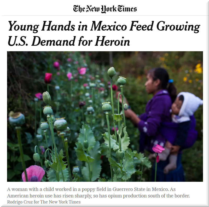 […] Nowhere is the toll of that surge more apparent than in Guerrero, the country’s most violent state, where rival drug factions perpetrate a war of bloody competition and silent disappearances that have paralyzed the region. Here, farmers are increasingly opting to grow poppies, cloaking remote mountainsides in the robust crop to eke out a living in places like Calvario where, as far as most are concerned, the government barely exists. To meet the demand, children are enlisted in the harvest, out of necessity and convenience. […] Not that anyone in Calvario much cares for — or even knows — of the broader debate over the drug trade. Villagers see little harm in cultivating opium. No one here uses the drug, or its derivative heroin, and the day rate for labor in the poppy fields is many times what is paid for shucking corn.