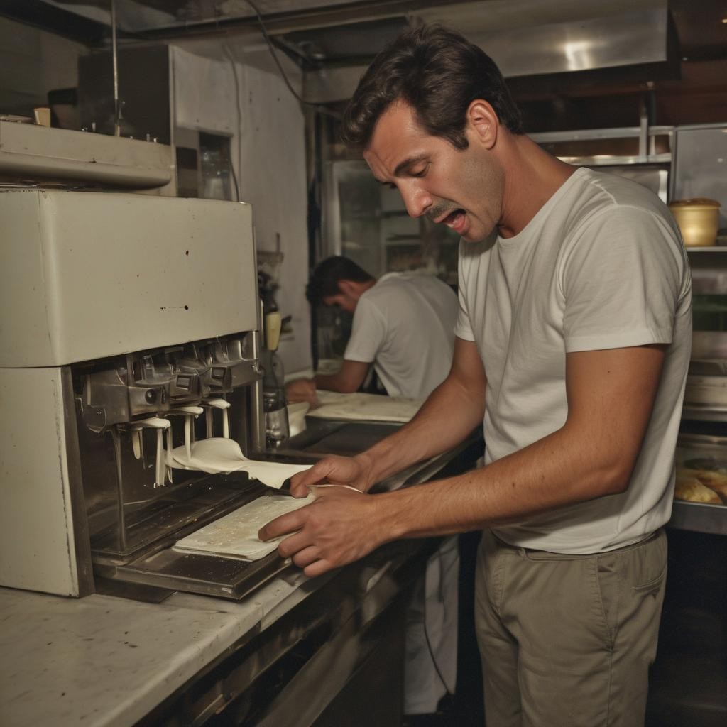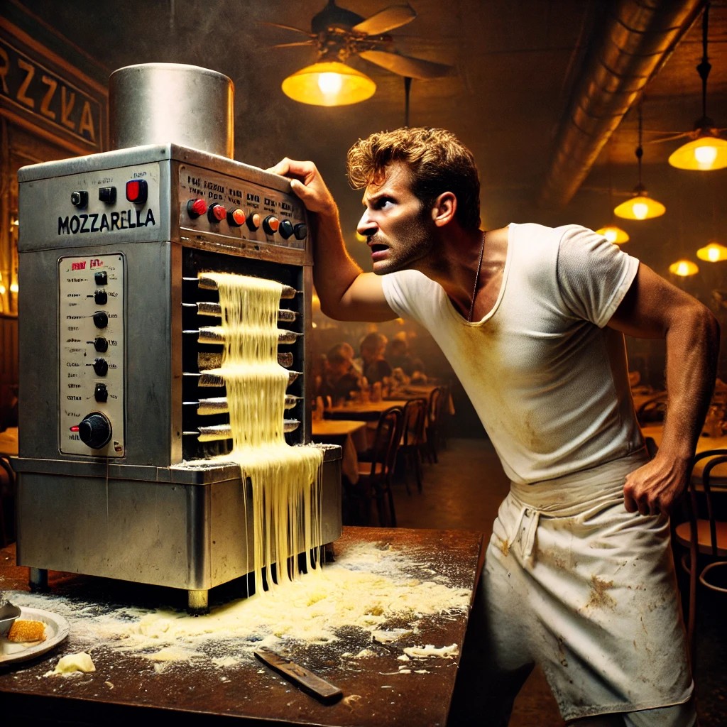 We decided to break into the small family Italian restaurant to see what was going on. It turned out that their automated mozzarella toasting machine was running amuck[1], pumping huge amounts of toasted cheese throughout the restaurant and overflowing into the parking lot.
