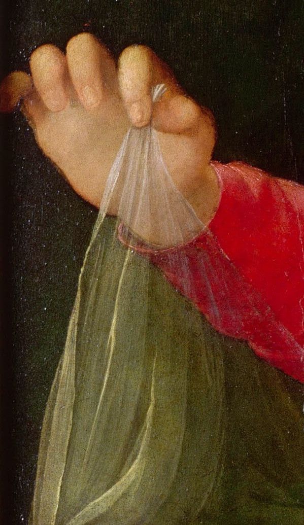 Saint Joseph’s melancholy nature in this picture may signal his proclivity for prophecy and the coming events for the Child. Saint Joseph seemed to be an after-thought, x-rays of the painting show that Saint Joseph was painted over a window previously over the Madonna’s shoulder.[2]