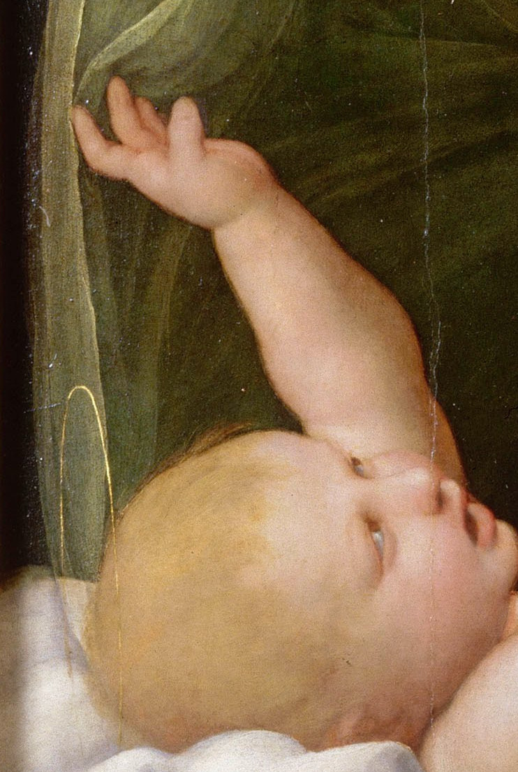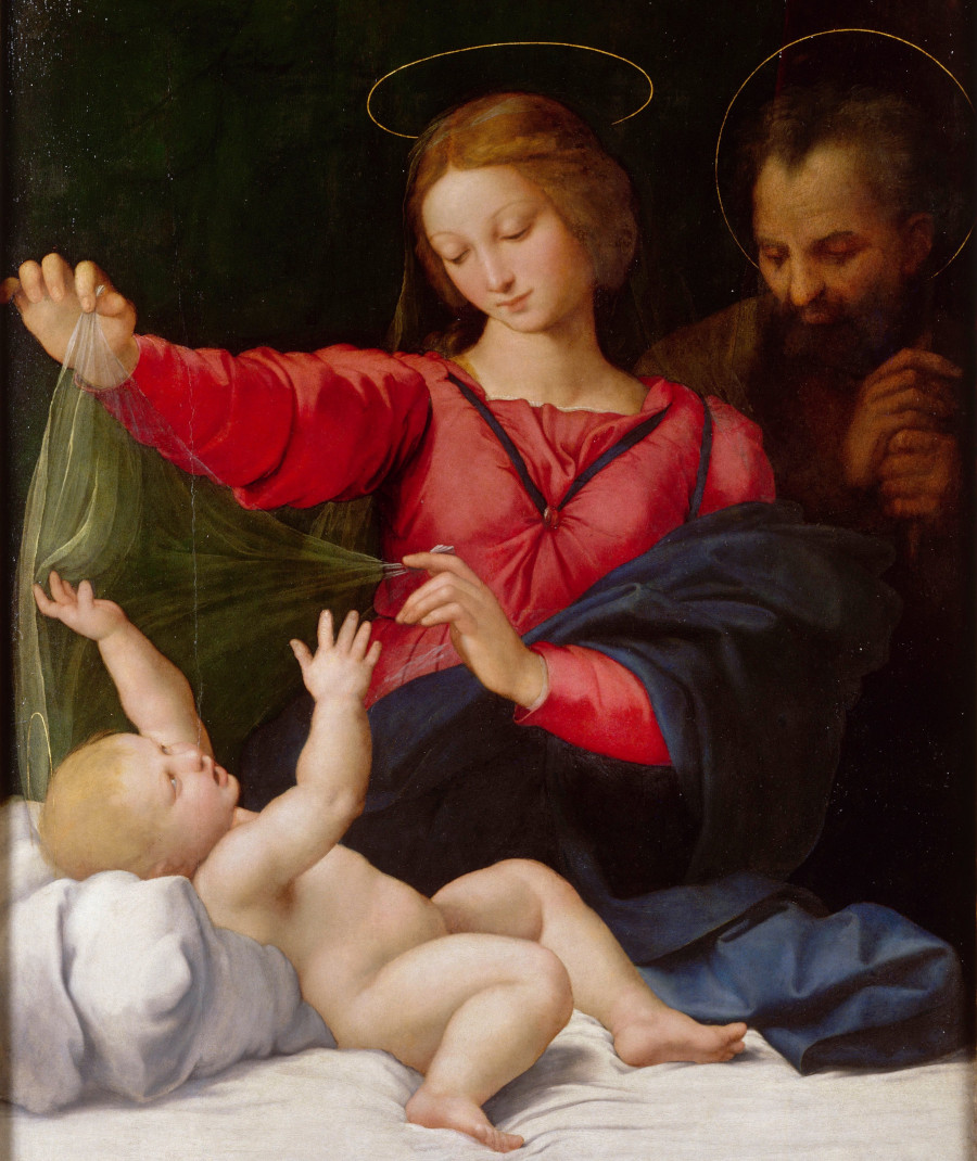 The painting is tender and intimate. The Child, just awakened, plays a game with the Madonna’s veil[1], with a melancholy Saint Joseph looking on from the shadows.