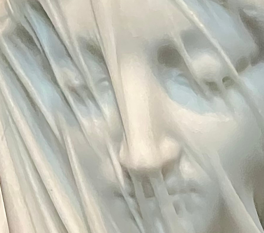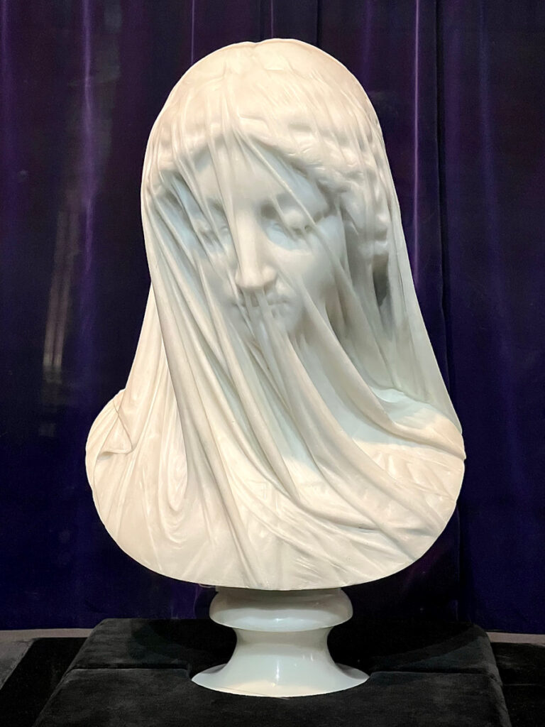 The Veiled Virgin is a Carrara marble statue carved in Rome by Italian sculptor Giovanni Strazza (1818–1875) depicting the bust of a veiled Virgin Mary. The exact date of the statue’s completion is unknown, but it was probably in the early 1850s. The veil gives the appearance of being translucent, but is carved of marble. – Wikipedia