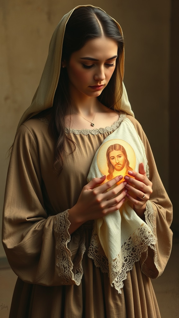 The story of the image’s origin is related to the sixth Station of the Cross, wherein Saint Veronica, encountering Jesus along the Via Dolorosa to Calvary, wipes the blood and sweat from his face with her veil. According to some versions, St. Veronica later traveled to Rome to present the cloth to the Roman Emperor Tiberius. The veil has been said to quench thirst, cure blindness, and even raise the dead.