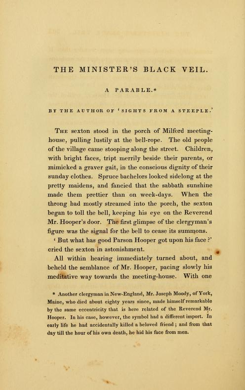 Mr. Hooper, a gentlemanly person, of about thirty, though still a bachelor, was dressed with due clerical neatness, as if a careful wife had starched his band, and brushed the weekly dust from his Sunday’s garb. There was but one thing remarkable in his appearance. Swathed about his forehead, and hanging down over his face, so low as to be shaken by his breath, Mr. Hooper had on a black veil.