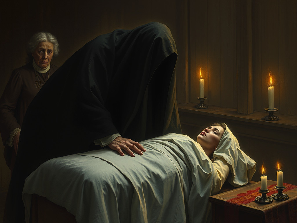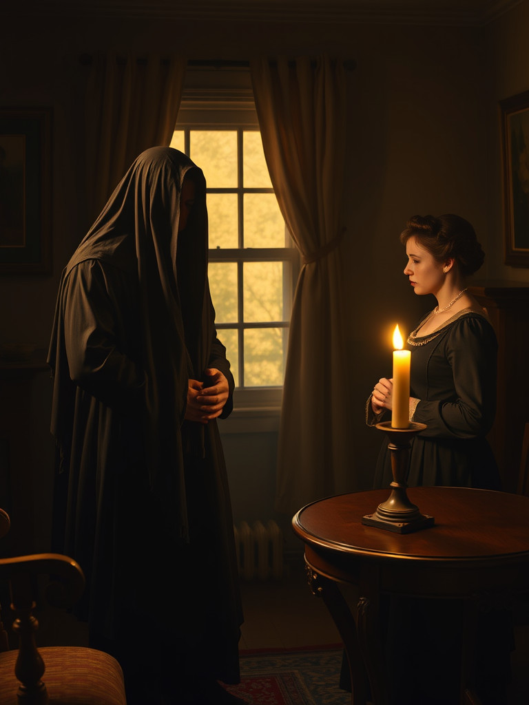 The clergyman stepped into the room where the corpse was laid, and bent over the coffin, to take a last farewell of his deceased parishioner. As he stooped, the veil hung straight down from his forehead, so that, if her eyelids had not been closed forever, the dead maiden might have seen his face. Could Mr. Hooper be fearful of her glance, that he so hastily caught back the black veil? A person who watched the interview between the dead and living, scrupled not to affirm, that, at the instant when the clergyman’s features were disclosed, the corpse had slightly shuddered, rustling the shroud and muslin cap, though the countenance retained the composure of death. A superstitious old woman was the only witness of this prodigy.