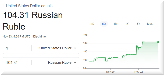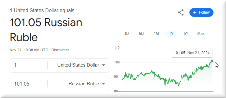 Wednesday’s rate, pegged at 100.03 rubles per dollar, reflects a nearly 19% devaluation since Ukraine’s surprise incursion into Russia’s Kursk region on Aug. 6. The ruble’s latest drop follows President Vladimir Putin’s decision to lower Moscow’s nuclear strike threshold after the U.S. gave Kyiv permission to fire long-range missiles at targets inside Russia.