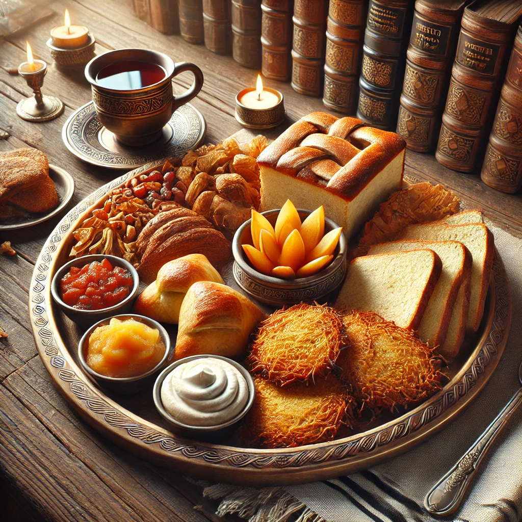 A freshly baked, braided loaf of bread with a glossy, golden exterior. Soft and slightly sweet, it’s a centerpiece on the platter, perfect for tearing and sharing.