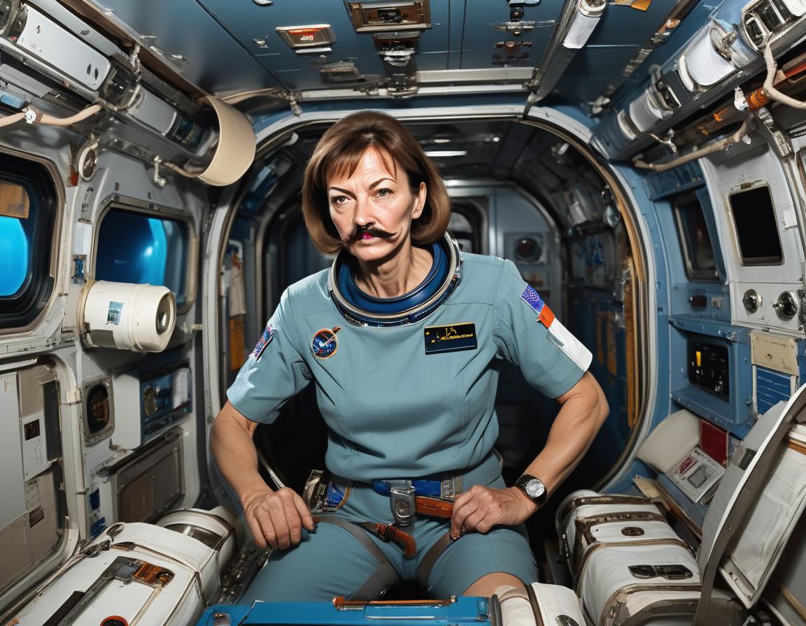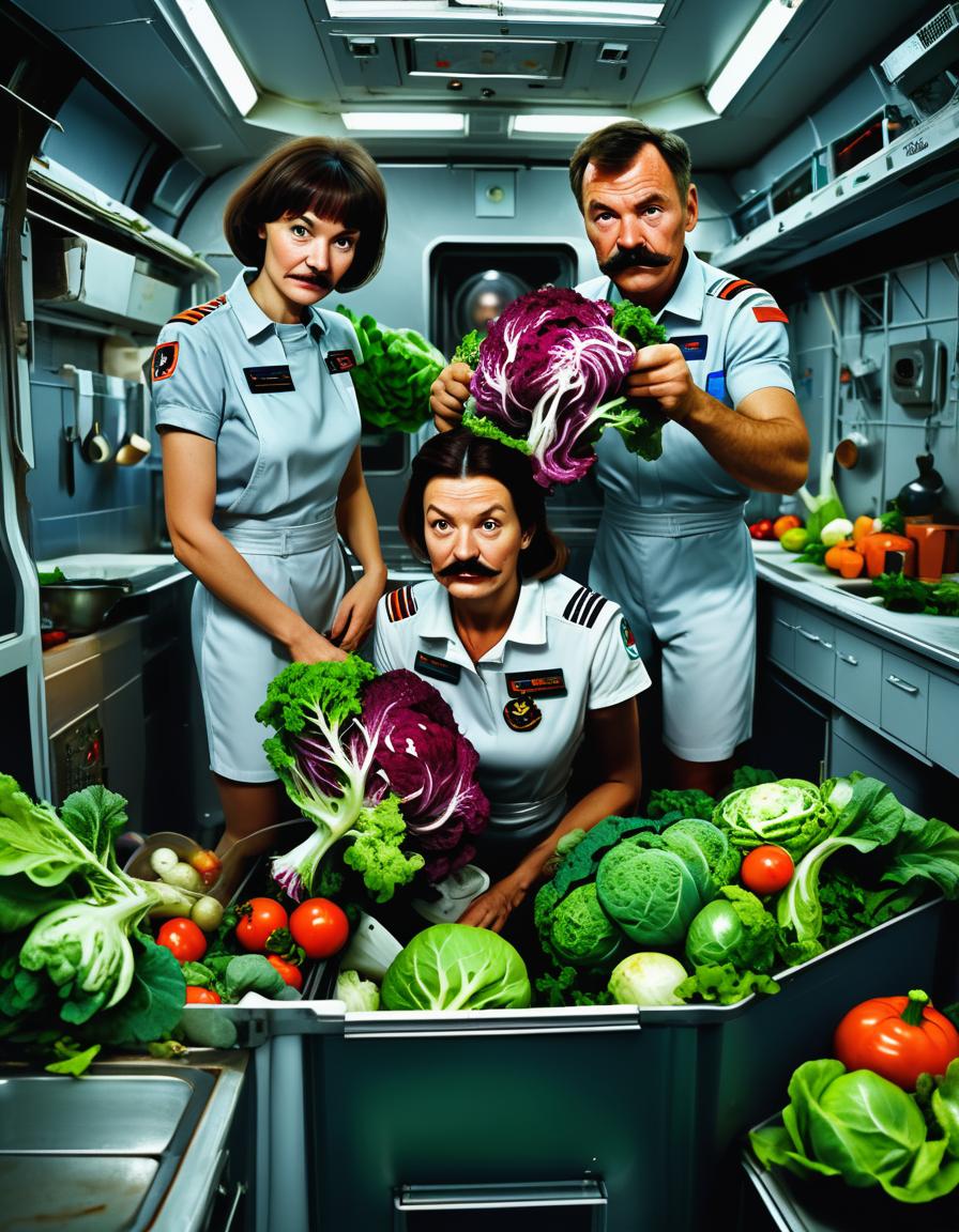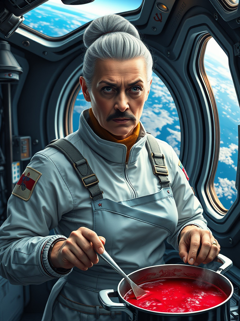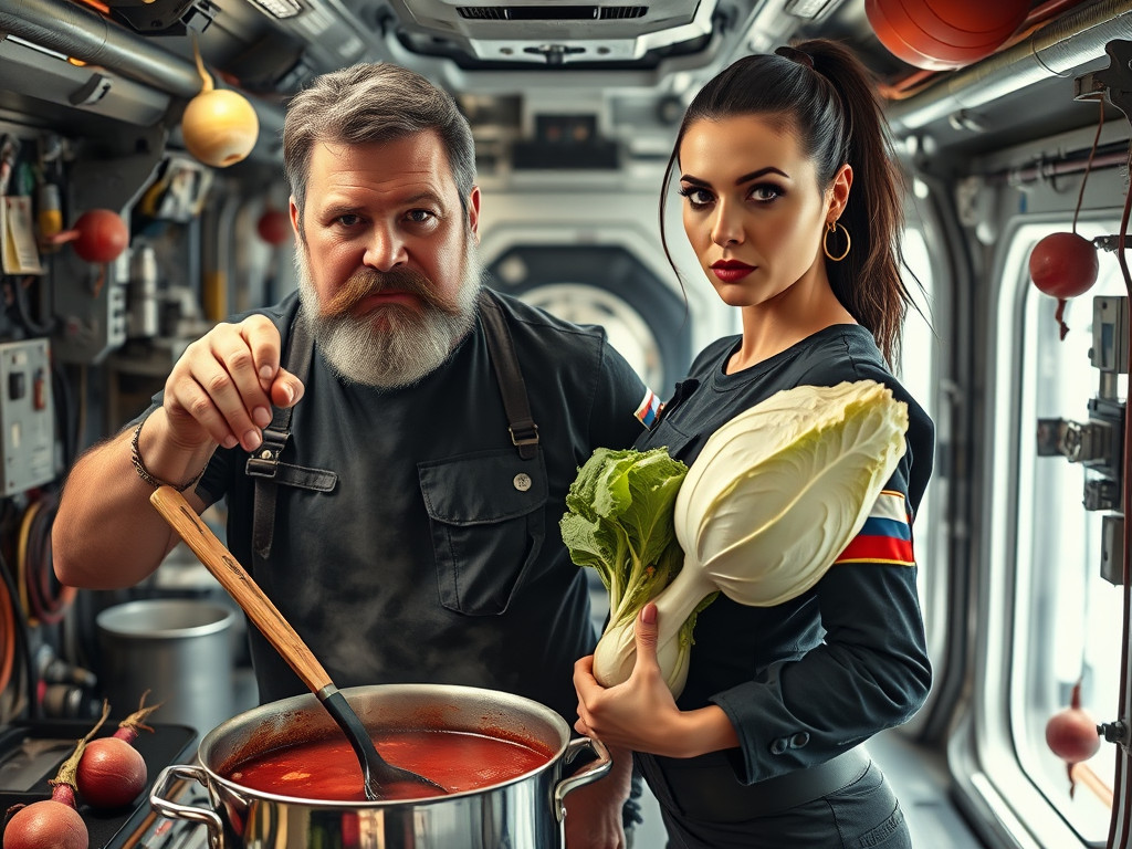 From the ISS side, the unmistakable sound of clinking pots and a faint, cheerful hum of Russian folk music drifts through the hatch. Suddenly, two Russian astronauts, Yuri and Svetlana, appear, wearing aprons over their flight suits.
