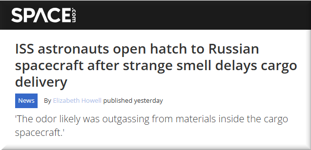 A robotic Progress spacecraft docked at the International Space Station as planned on Saturday (Nov. 23) after its launch on Nov. 21, but astronauts reported a strange stench coming from the vehicle that delayed unloading. …. The astronauts and ISS were never in any danger as a result of the stink, NASA has stressed. The agency added on Monday that the odor “likely was outgassing from materials inside the cargo spacecraft,” but did not offer more specifics.