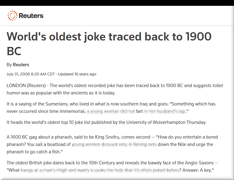 [censored by the WLBOTT Ministry of Vice and Virtue]” It’s evidence that humor about daily life and bodily functions has always been a thing!- Oral Traditions: Before written records, stories and jokes were shared orally. Humor would have been a way to make tales memorable, entertaining, and relatable.
