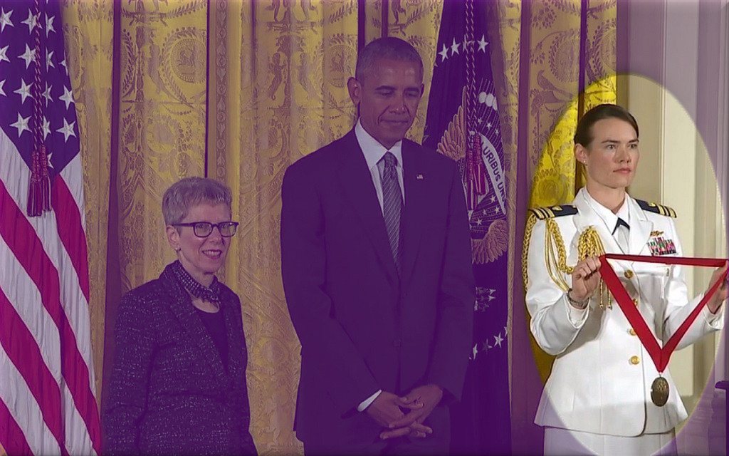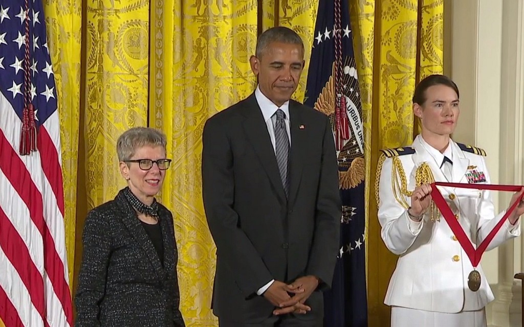 Terry Gross, about to be awarded the National Humanities Medal by President Obama at the White House. Screen capture of a video marked “Public Domain” by the White House – Wikipedia