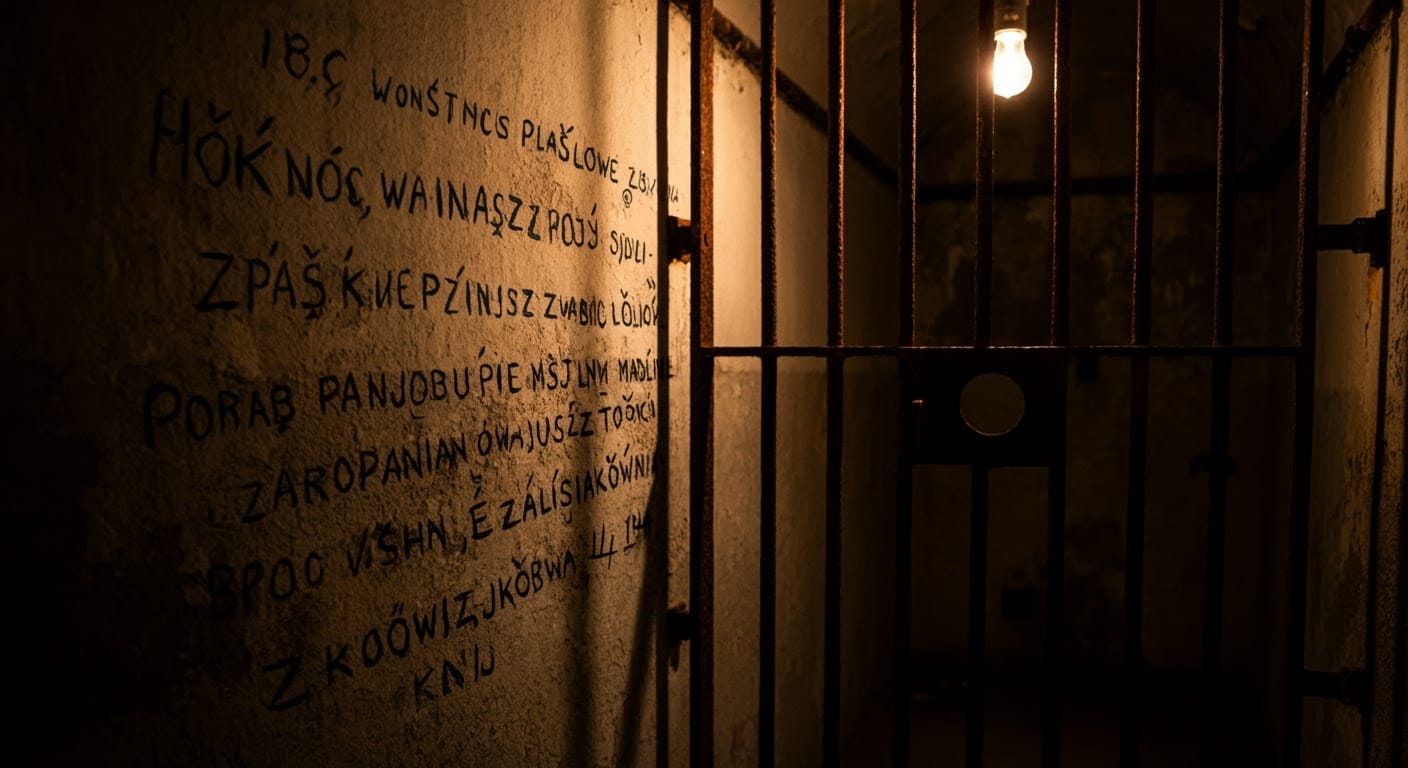 Text: An inscription scrawled on the wall of a Gestapo prison cell in Zakopane during World War II by an 18-year-old Polish girl, Helena Wanda Błażusiakówna. She was captured on June 25, 1944.