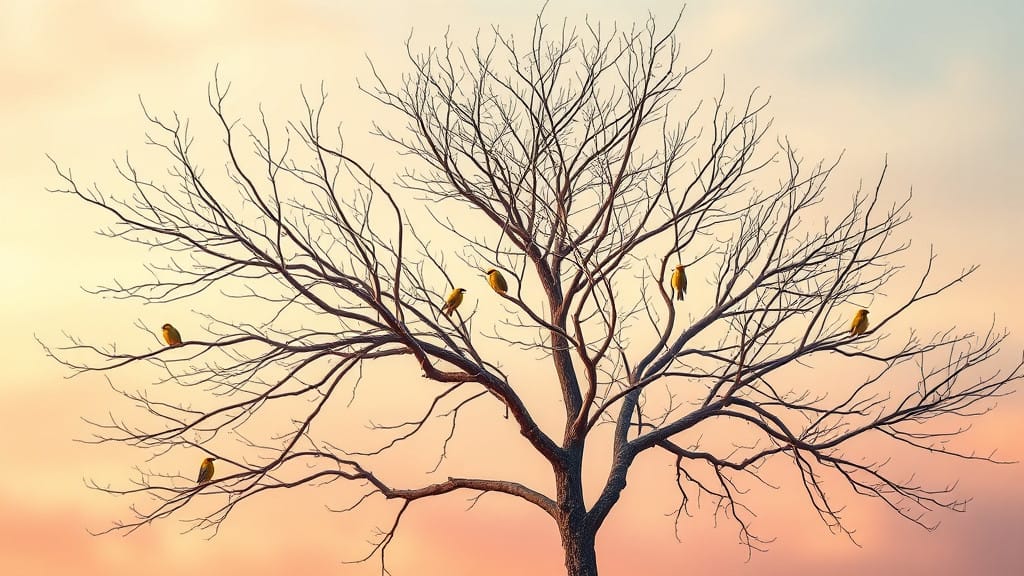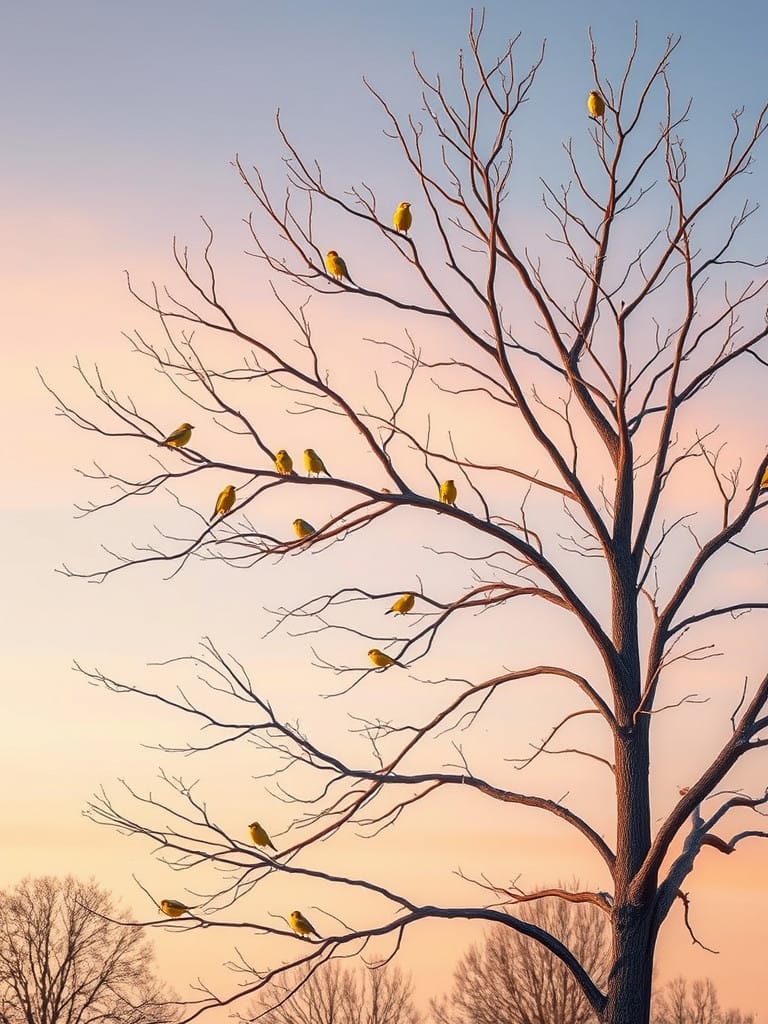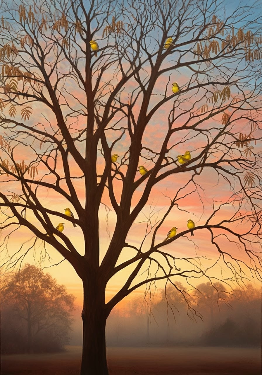 A flock of small yellow birds descended on our pecan tree in the early morning. (Elder G recreated the scene.)