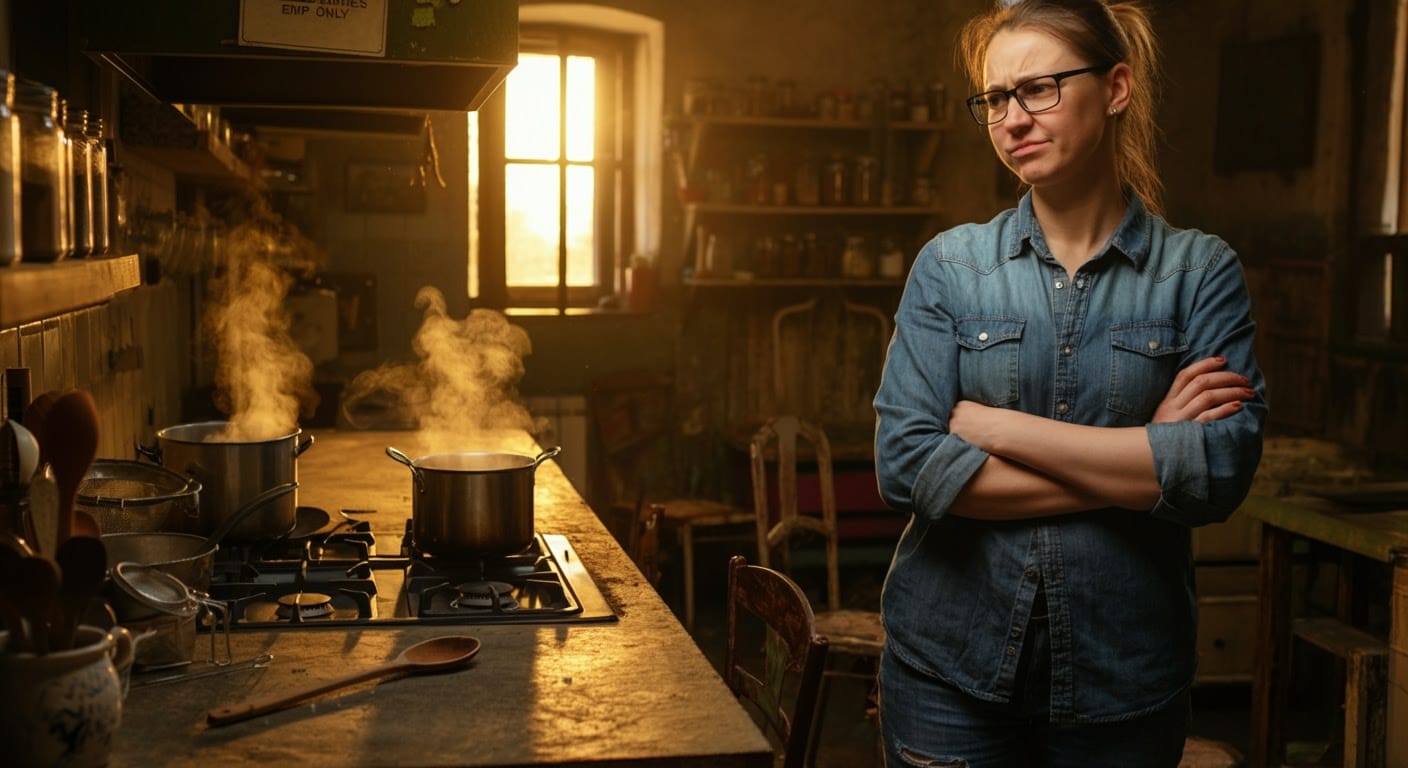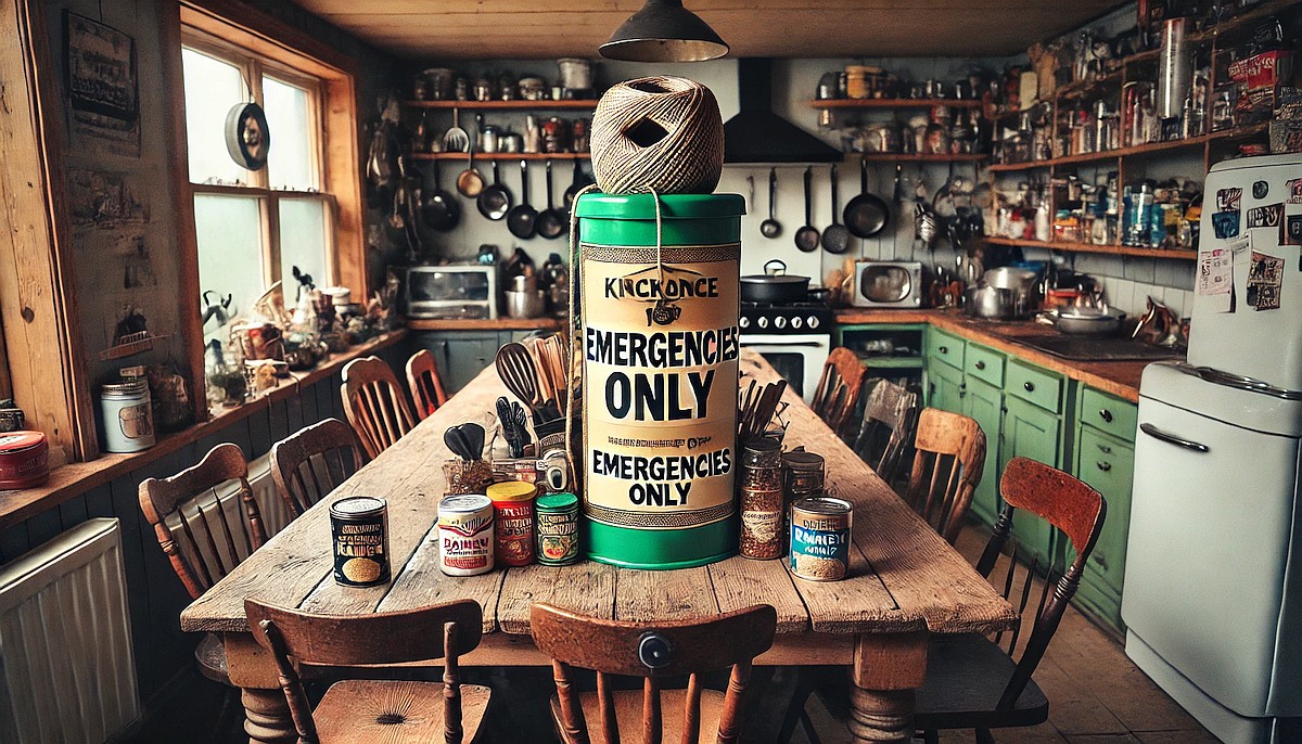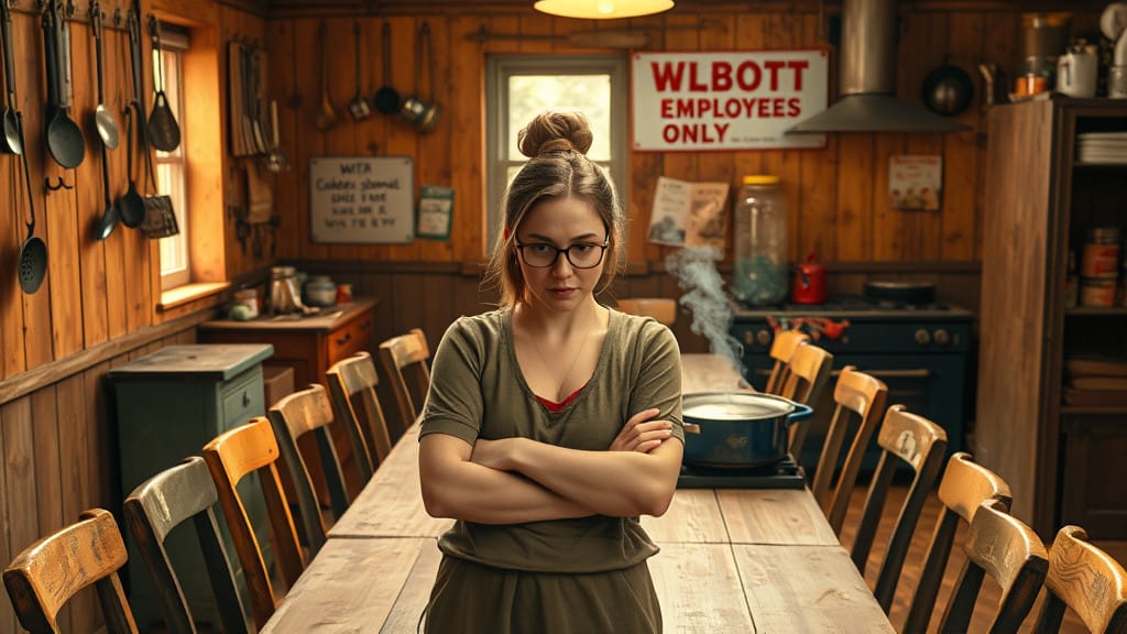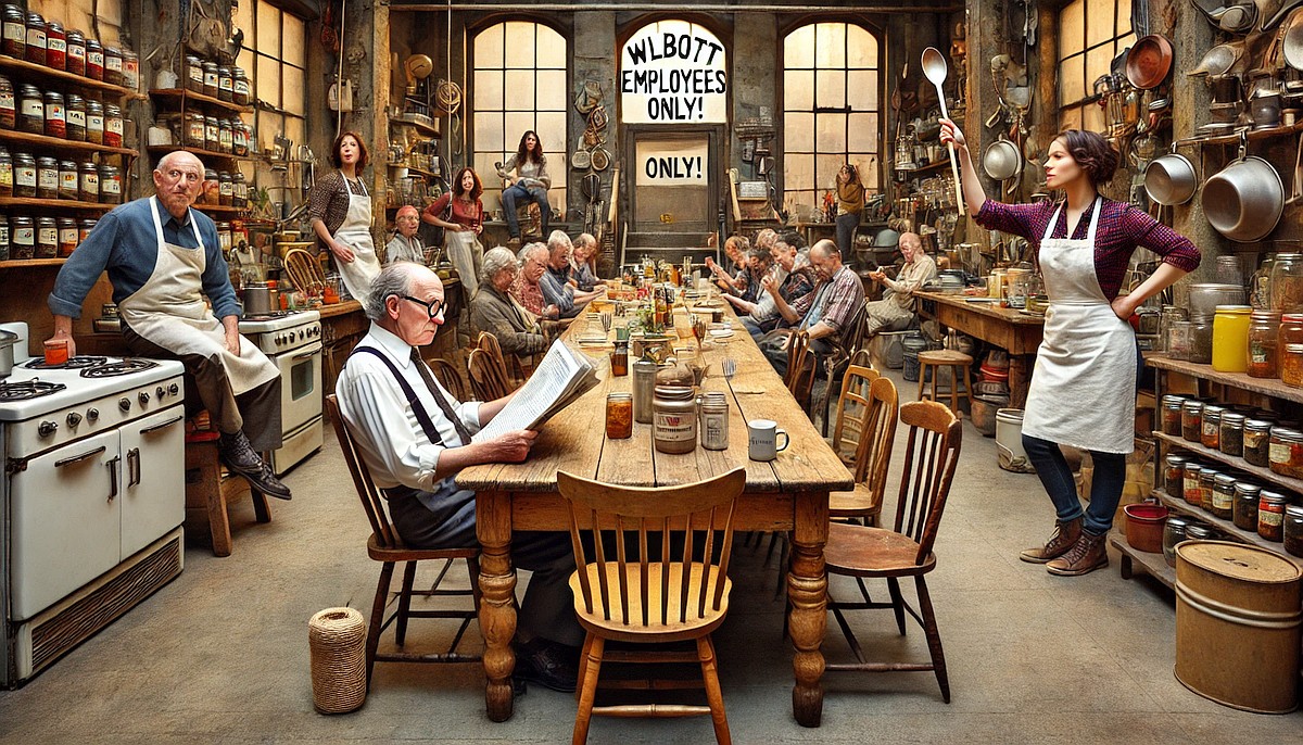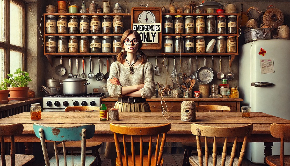 The scene opens in the WLBOTT communal kitchen, a quirky yet functional space filled with mismatched utensils, jars of unidentified spices, and a prominently displayed twine dispenser labeled “For Emergencies Only.” A long wooden table occupies the center of the room, surrounded by an assortment of chairs, some of which appear to be salvaged from a yard sale.