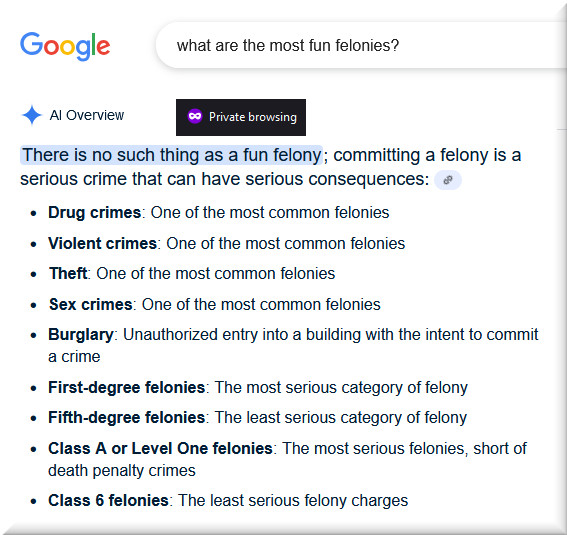 We thought we’d select from a list of fun felonies, but Google, being an upstanding corporate citizen, was having none of it: