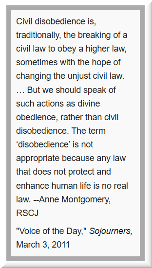 Some members of the movement damaged nuclear weapons and military bases to directly disarm the facilities. Montgomery was among the first that were arrested for these acts, and served time in prison. She participated in several other Plowshares movement actions, including one in 2009, at the age of 83. She was best known for insisting that her work was not civil disobedience, but divine obedience.