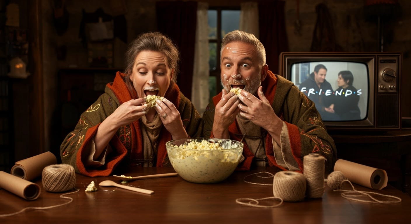 Spousal Unit and I were eating egg salad (no utensils allowed!) and watching the very first episode of Friends.