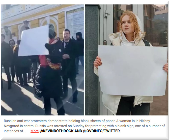 As mass demonstrations against Russia’s invasion of Ukraine continue to intensify, a woman in in Nizhny Novgorod, in central Russia, was arrested on Sunday for protesting with a blank sign.
