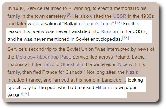 Lot of interesting trivia about the guy – he drove an ambulance in WWI (like Hemingway), and was in a 1942 movie with Marlene Dietrich, and he managed to irritate both the Nazis and our friends from the former Soviet Union, so well done, Mr. Service!