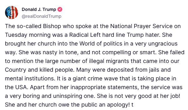 In January 2025, Budde delivered the homily at the interfaith prayer service following Donald Trump’s second presidential inauguration. Her sermon called for compassion toward marginalized groups. Trump and some of his supporters criticized her remarks, while other public figures and church leaders supported her. Budde later stated that her sermon emphasized leadership qualities like mercy and unity.