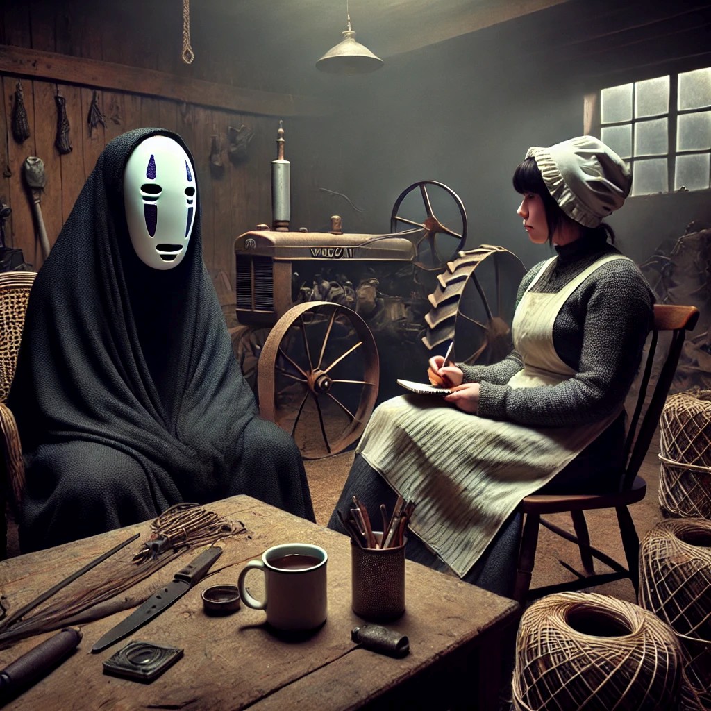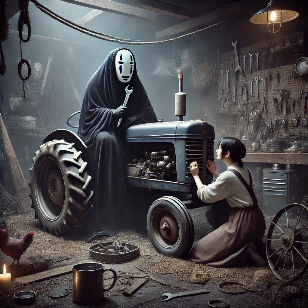 No-Face (pauses, then gestures vaguely toward the scattered tractor parts, as if searching for the right words): “…Mmm…”