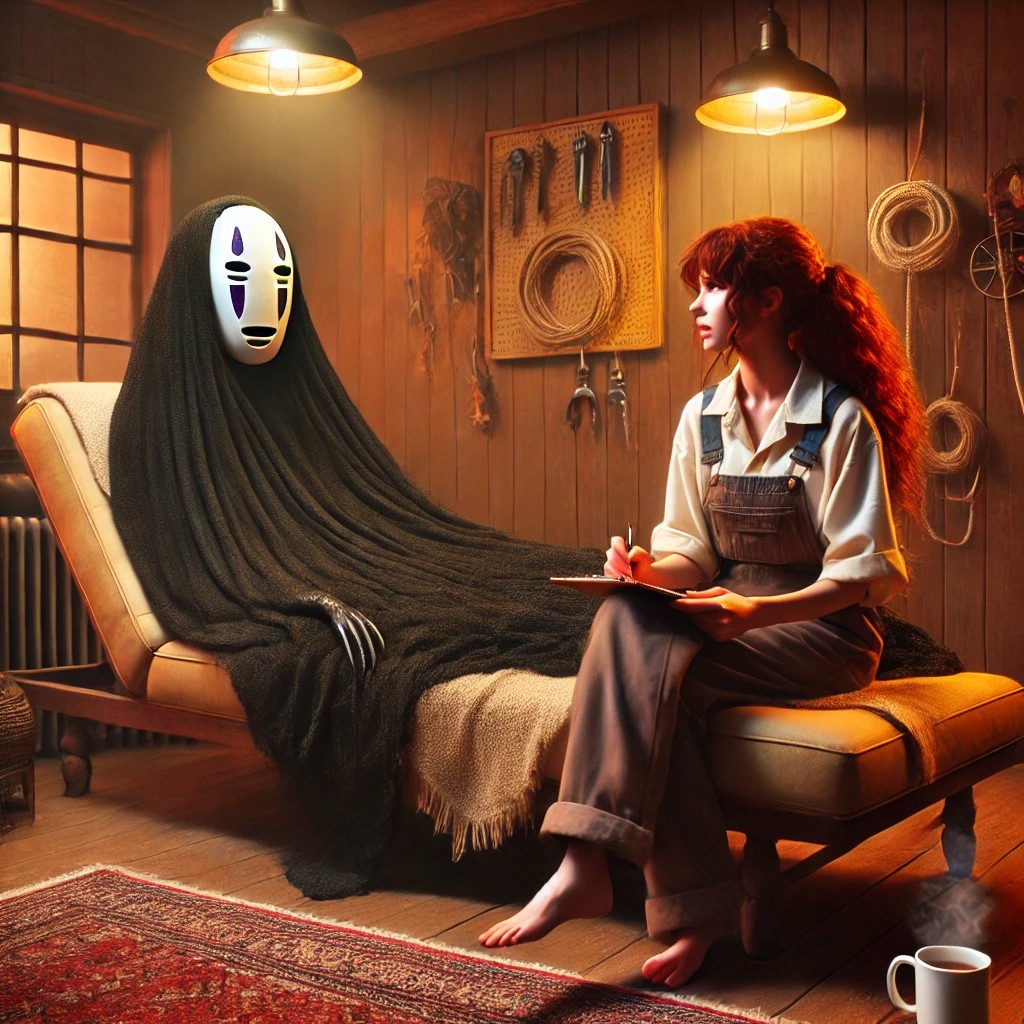 No-Face (tilts head slightly, emitting a soft, echoing sigh): “Mmmm…” (produces a handful of gold coins and places them on the table).