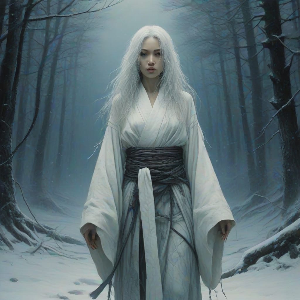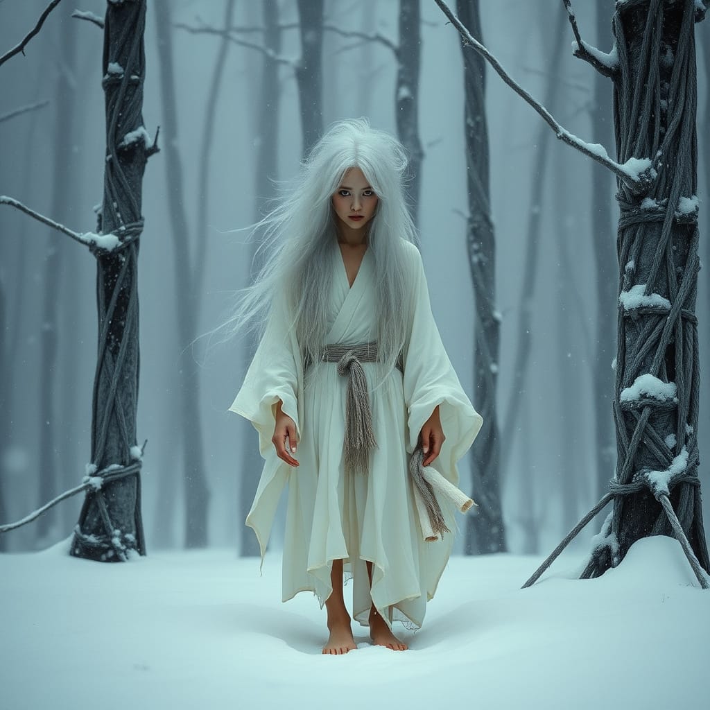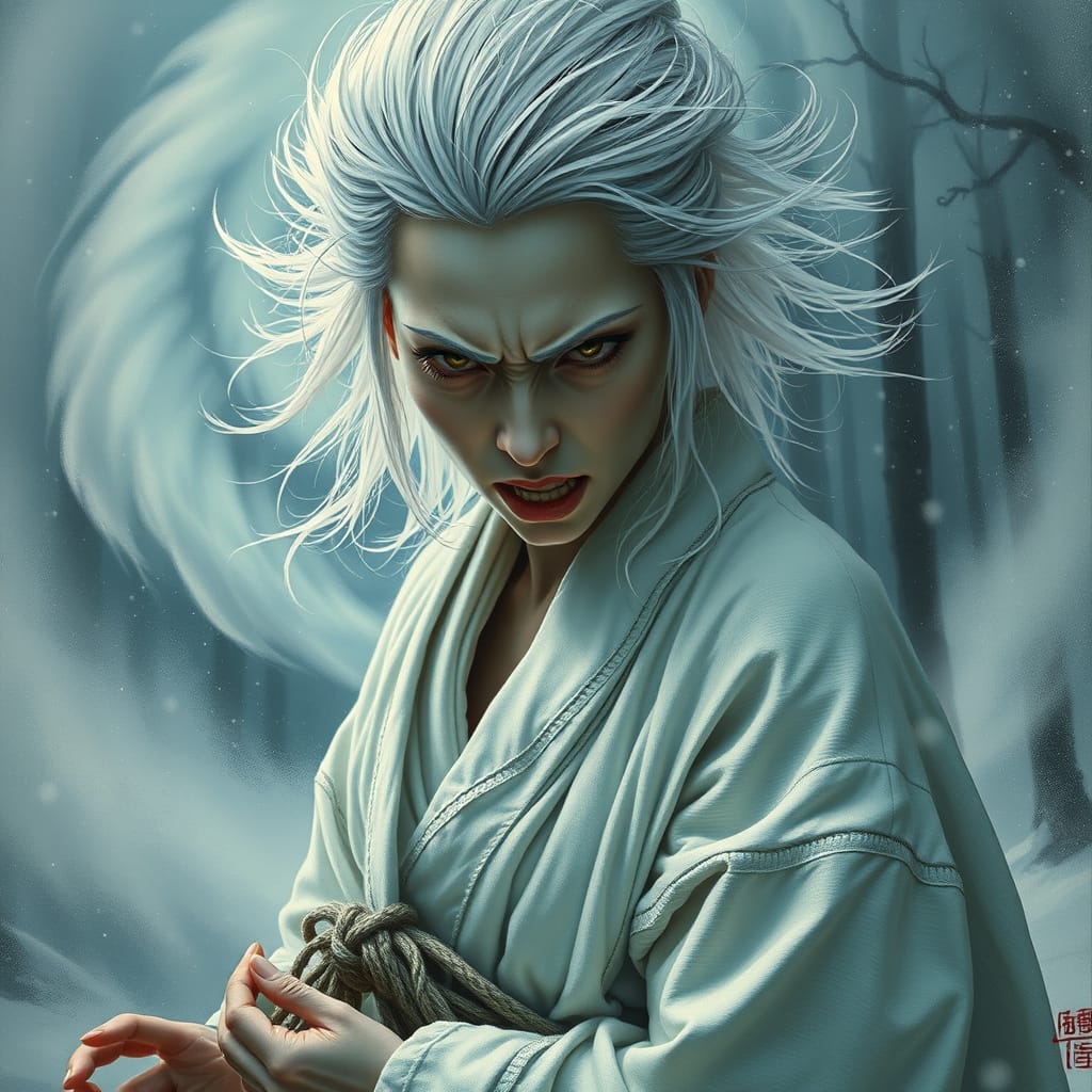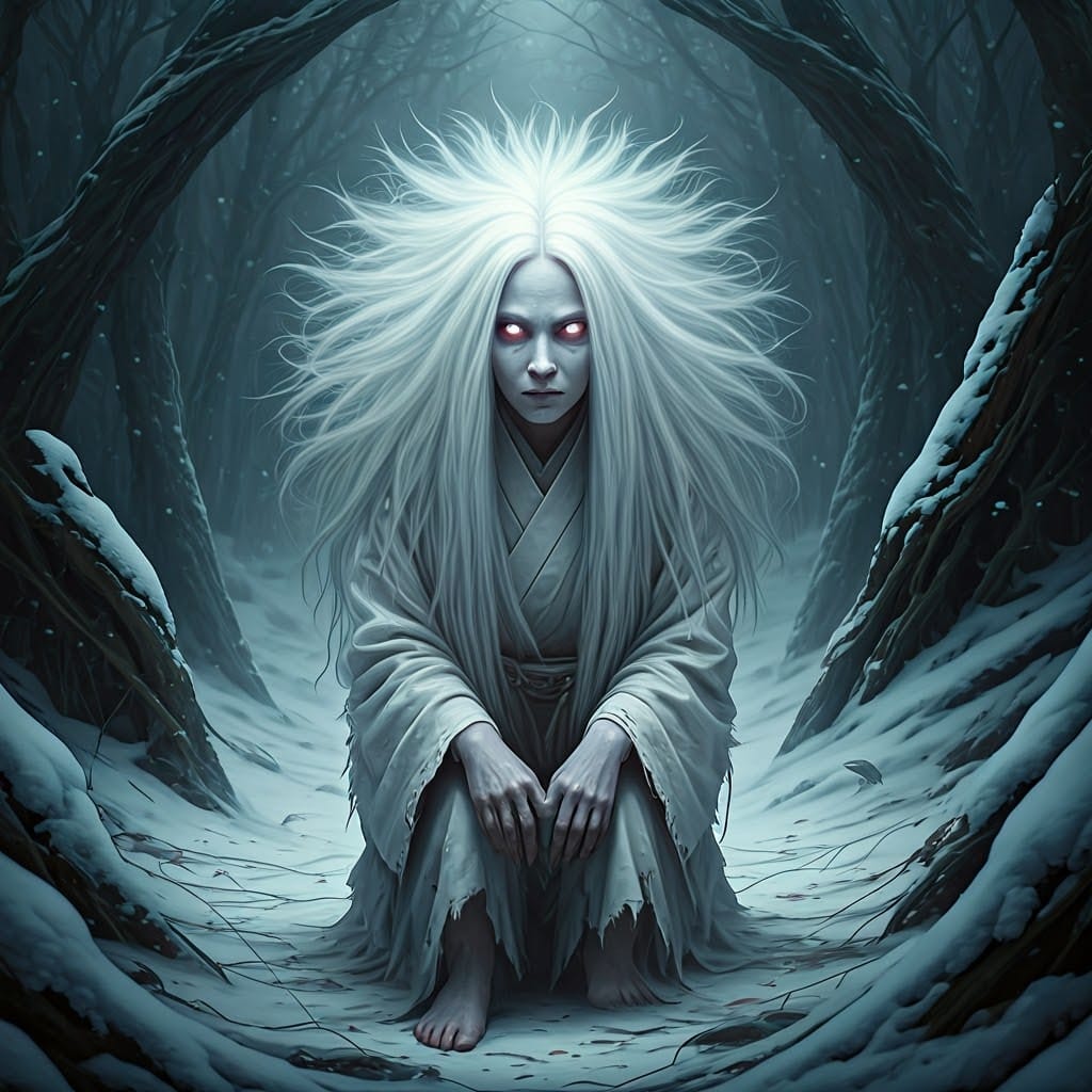 Two woodcutters named Minokichi and Mosaku take refuge in a boatman’s hut during a snowstorm. Mosaku is killed by a yuki-onna. When the yuki-onna turns to Minokichi, she sympathetically remarks that he is a handsome boy and spares him because of his youth, warning him to never mention what happened or she will kill him. Minokichi returns home and never mentions that night.