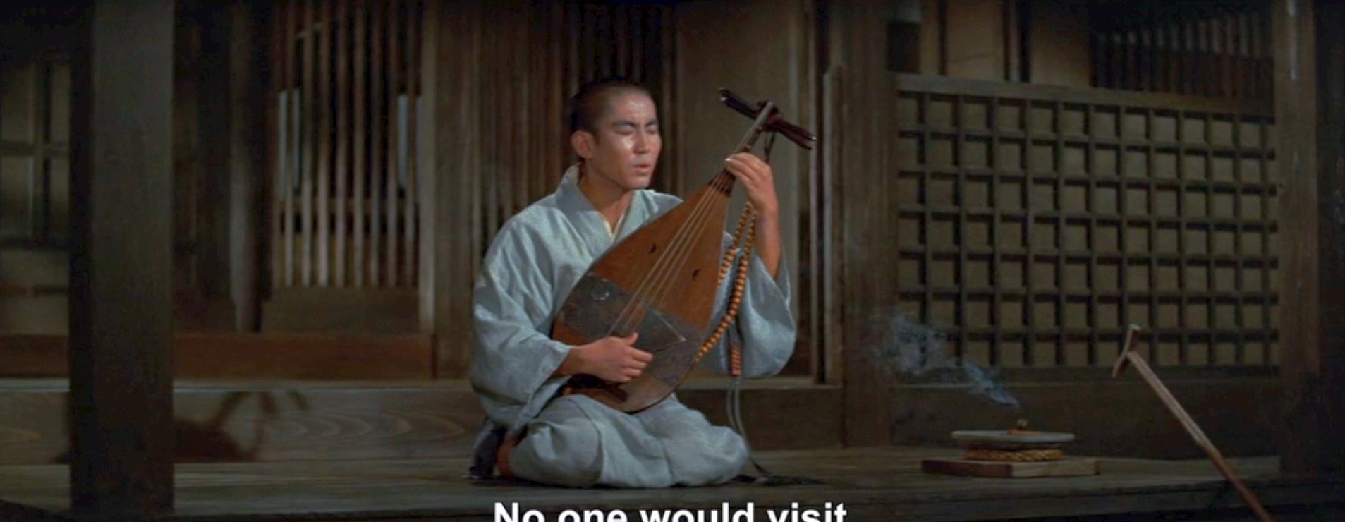 Hoichi is a young blind musician who plays the biwa. His specialty is singing the chant of The Tale of the Heike about the Battle of Dan-no-ura fought between the Taira and Minamoto clans during the last phase of the Genpei War. Hoichi is an attendant at a temple and is looked after by the others there. One night he hears a sound and decides to play his instrument in the garden courtyard. A spectral samurai appears and tells him that his lord wishes to have a performance at his house. The samurai leads Hoichi to a mysterious and ancient court.