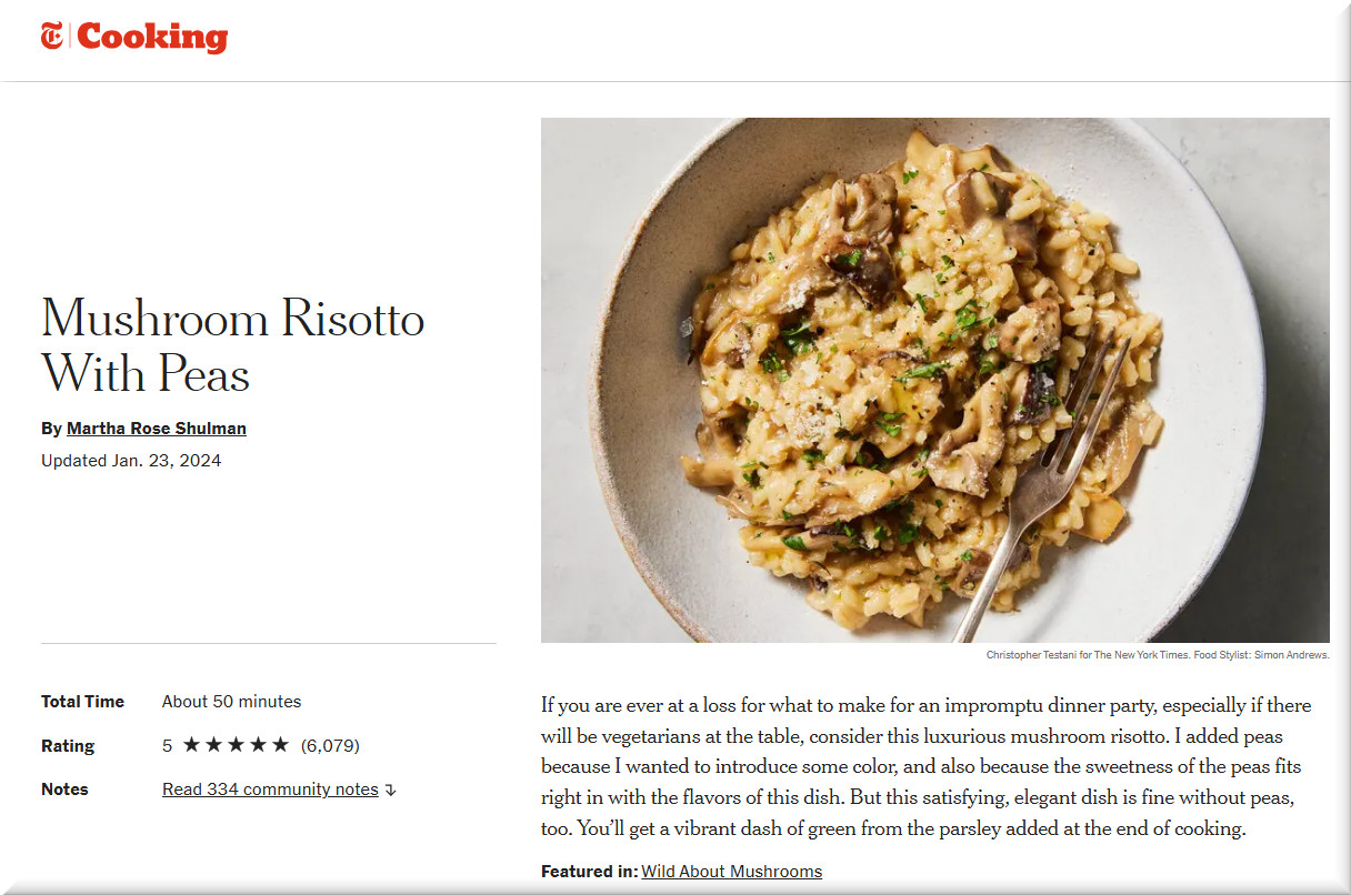 Martha Rose’ top rated NYT recipe is for mushroom risotto with peas, with over six thousand likes!