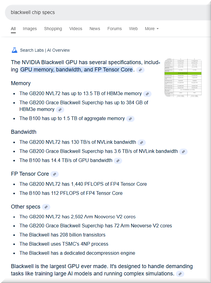 World’s Most Powerful Chip — Packed with 208 billion transistors, Blackwell-architecture GPUs are manufactured using a custom-built 4NP TSMC process with two-reticle limit GPU dies connected by 10 TB/second chip-to-chip link into a single, unified GPU.[1]
