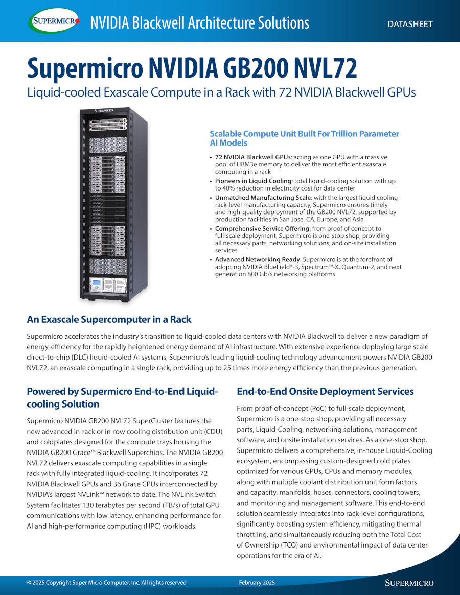The heart of the GB200 NVL72 is the NVIDIA GB200 Grace Blackwell Superchip. It connects two high-performance NVIDIA Blackwell Tensor Core GPUs and the NVIDIA Grace CPU with the NVLink-Chip-to-Chip (C2C) interface that delivers 900 GB/s of bidirectional bandwidth. With NVLink-C2C, applications have coherent access to a unified memory space. This simplifies programming and supports the larger memory needs of trillion-parameter LLMs, transformer models for multimodal tasks, models for large-scale simulations, and generative models for 3D data.[2]